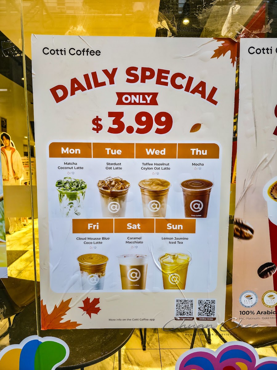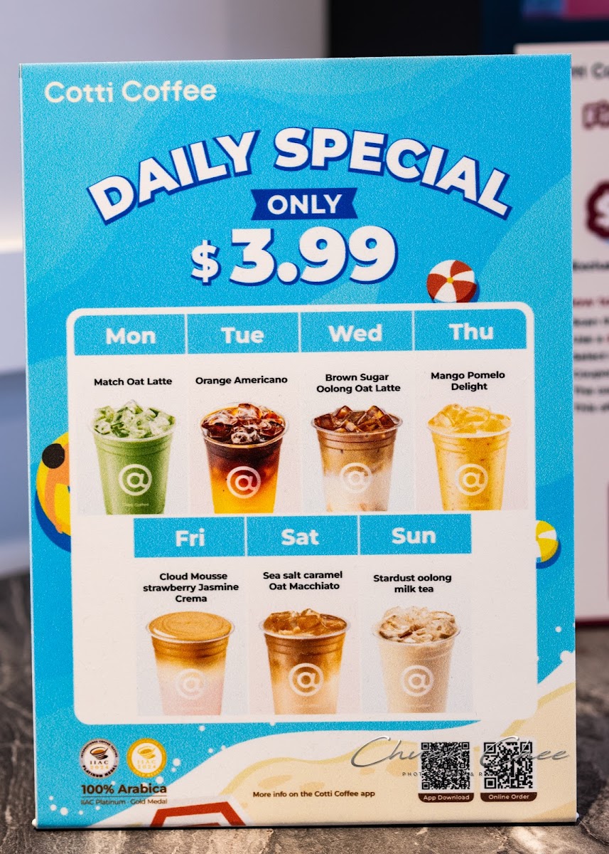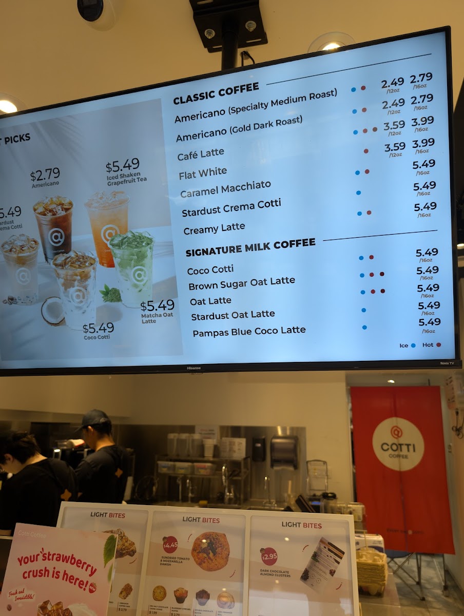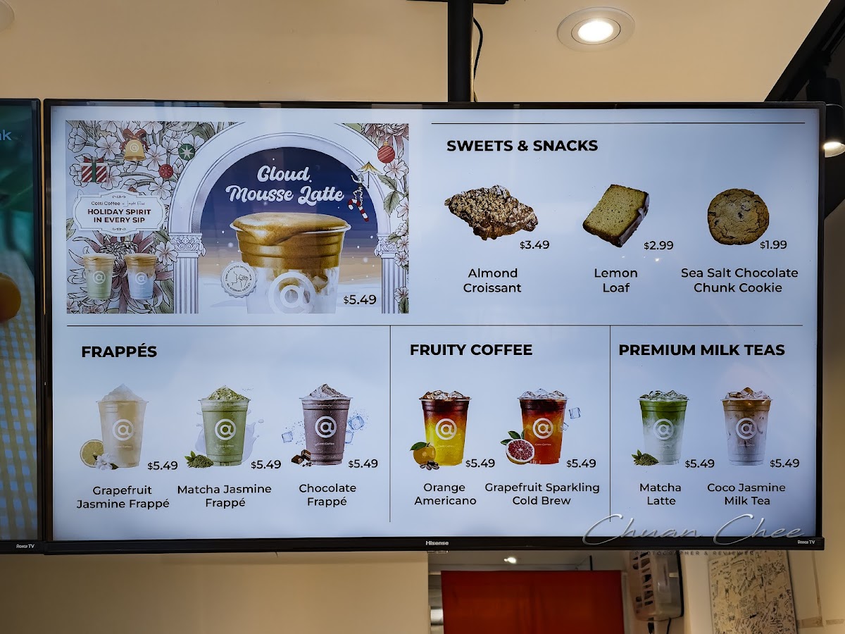 From a reviewer’s perspective, the menu at Cotti Coffee feels thoughtfully diverse, balancing classic staples with creative, modern twists. The Americano (Medium Roast) and Extra Shot Americano (Dark Roast) cater well to purists, while options like the Vanilla Cheese Foam Americano add a playful edge. The latte lineup, including Café Latte, Brown Sugar Latte, and Hazelnut Latte, offers familiar comfort with subtle variety. More distinctive are the signature drinks such as Coco Cotti, Pampas Blue Coco Latte, and Brown Sugar Oat Latte, which bring a trendy, slightly indulgent flair. Tea lovers aren’t left out, with refreshing picks like Iced Shaken Grapefruit Tea and Iced Shaken Bergamot Lemon Tea, alongside richer choices like Matcha Coconut Latte and Coco Jasmine Milk Tea. The fruity coffee selections-especially the Grapefruit Sparkling Cold Brew-stand out as refreshing alternatives, while the frappé range, including Matcha Jasmine Frappé and Mocha Frappé, leans toward dessert-like indulgence. To round things out, the dessert menu featuring Original Plain Cheesecake, Blueberry Swirl Cheesecake, and Lemon Poppyseed Coffee Cake complements the drinks nicely. While prices aren’t listed here, the variety and creativity of the offerings suggest a menu designed to appeal to both traditional coffee drinkers and those seeking something more unique.