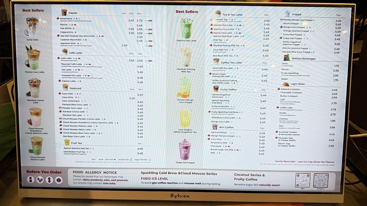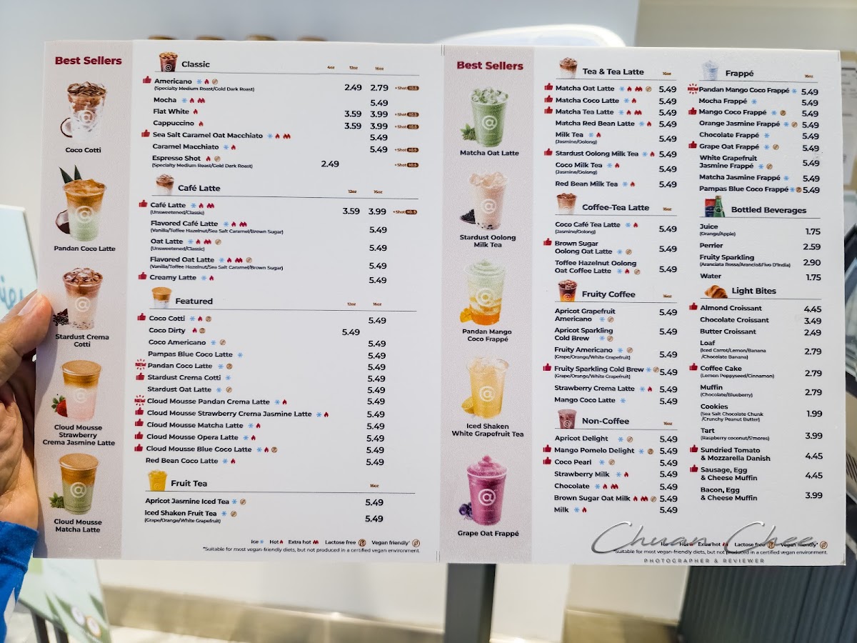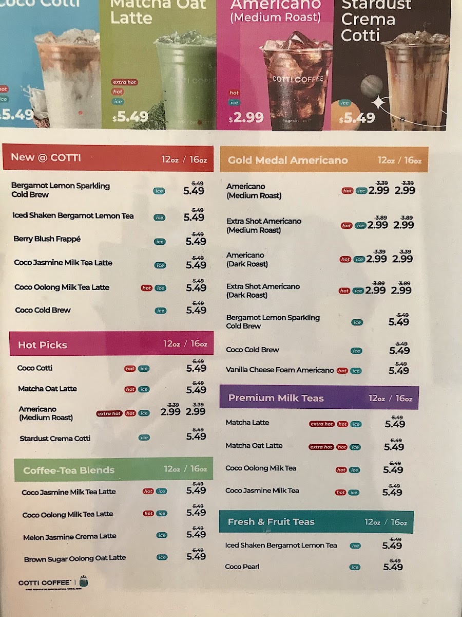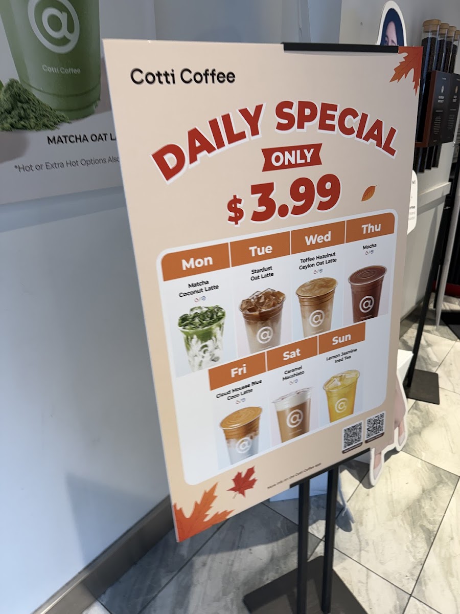 From a reviewer’s perspective, the menu at Cotti Coffee feels thoughtfully diverse, balancing classic staples with creative, modern twists. The Americano (Medium Roast) and Extra Shot Americano (Dark Roast) cater well to purists, while options like the Vanilla Cheese Foam Americano add a playful edge. The latte lineup, including Café Latte, Brown Sugar Latte, and Hazelnut Latte, offers familiar comfort with subtle variety. More distinctive are the signature drinks such as Coco Cotti, Pampas Blue Coco Latte, and Brown Sugar Oat Latte, which bring a trendy, slightly indulgent flair. Tea lovers aren’t left out, with refreshing picks like Iced Shaken Grapefruit Tea and Iced Shaken Bergamot Lemon Tea, alongside richer choices like Matcha Coconut Latte and Coco Jasmine Milk Tea. The fruity coffee selections-especially the Grapefruit Sparkling Cold Brew-stand out as refreshing alternatives, while the frappé range, including Matcha Jasmine Frappé and Mocha Frappé, leans toward dessert-like indulgence. To round things out, the dessert menu featuring Original Plain Cheesecake, Blueberry Swirl Cheesecake, and Lemon Poppyseed Coffee Cake complements the drinks nicely. While prices aren’t listed here, the variety and creativity of the offerings suggest a menu designed to appeal to both traditional coffee drinkers and those seeking something more unique.